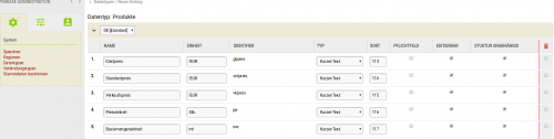 Hier erhalten Sie einen Überblick, welche Datentypen angelegt sind. Datentypen beinhalten verschiedene Eigenschaften und sind in einer Gruppe zusammengefasst z. B. Produkte. Zu finden unter dem Reiter ,,System" in der Administration.